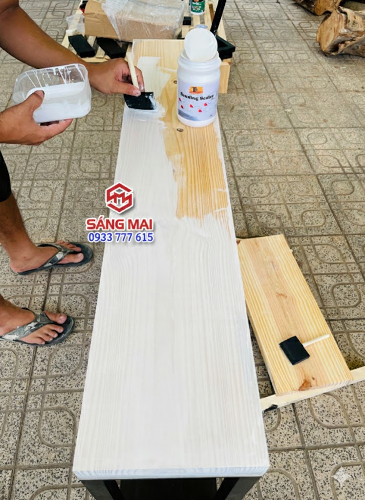 – Bước 2: Chờ sơn lót khô, dùng giấy nhám hạt 320( hoặc 240 ) xả nhẹ sơn lại cho bề mặt gỗ căng mịn.